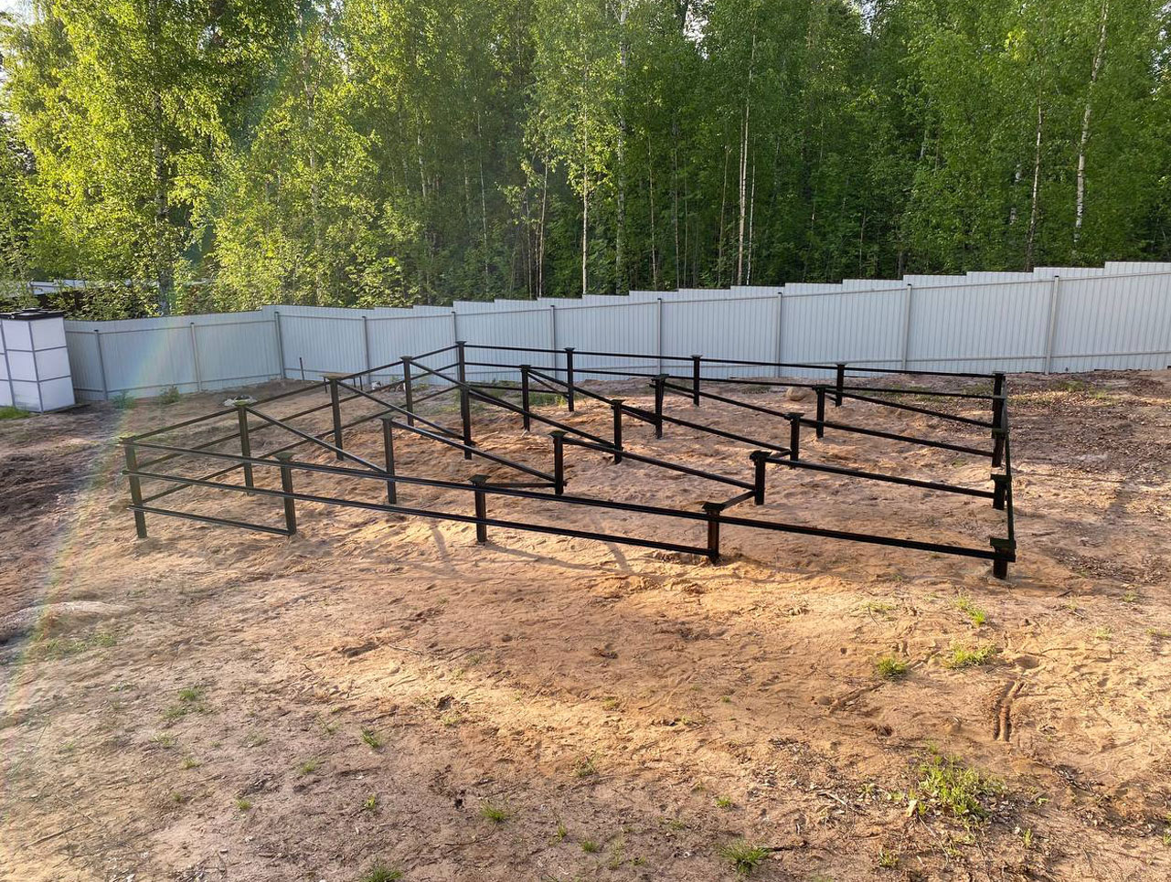 Место: Волосовский район, д.Остроговицы Задача: фундамент под каркасный дом и навес под авто Грунт: песок Фундамент: закрутили вручную свай 108мм (4мм), услили периметр швеллером и трубой.