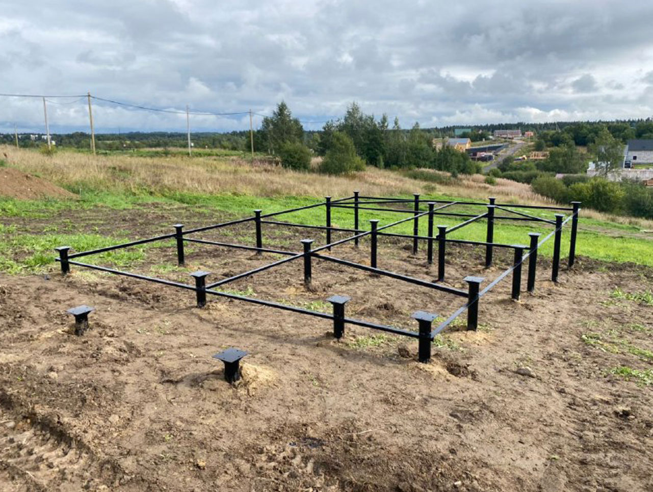 Место: Лен. область Задача: фундамент под Каркасный дом Грунт: суглинок Фундамент: закрутили вручную 16 свай 108мм (4мм). Обвязка уголком 50мм для жесткости. Усиленные оголовки.